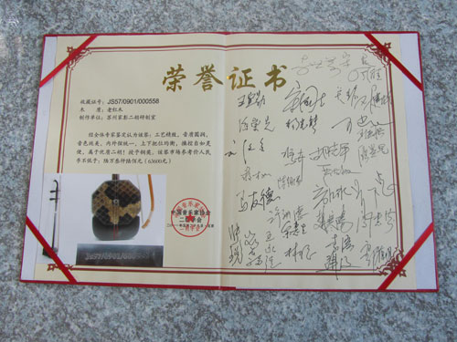 琴體采用蘇州傳統(tǒng)蟲膠擦漆工藝,手工拋光打磨,可清晰顯露出紫檀木細密的毛孔,整琴制作精致細膩,演奏手感非常舒適,上下?lián)Q把輕松自如,有利演奏技巧的發(fā)揮